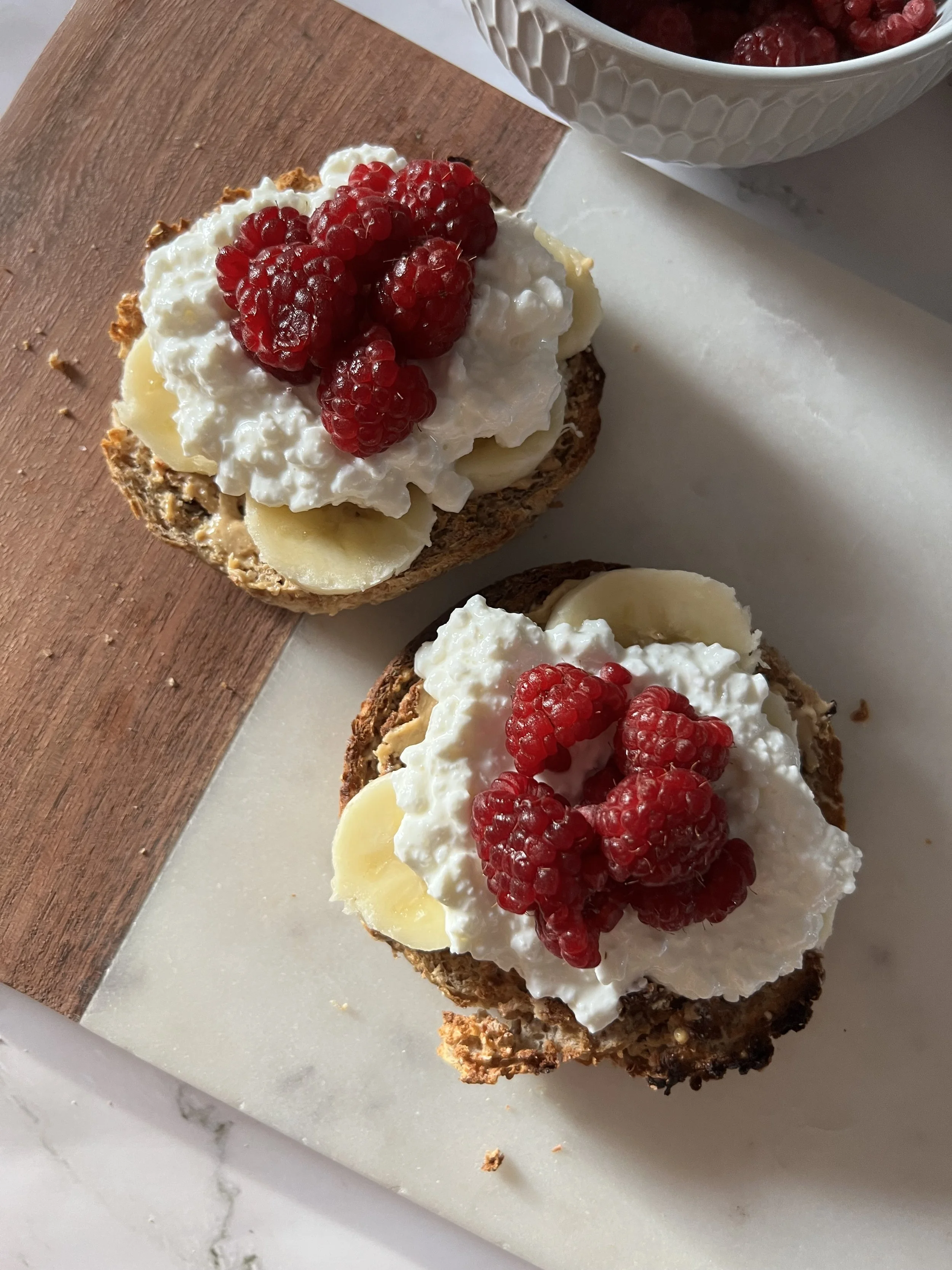 Dans un grille-pain, faire rôtir l’English muffin. Tartiner le beurre de cajous puis ajouter les tranches de banane, une cuillerée de fromage cottage et les framboises. Maintenant, déguste et partage sur les réseaux sociaux ! 🙂
